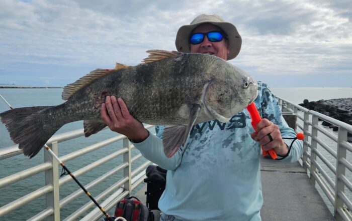 Last week Wednesday through Friday the water had warmed up to 70 degrees which sparked a short-lived bite of the fish. Black drum, redfish, and some slot and oversized snook were being caught in the early morning hours, just after sunup on live shrimp at the jetty tip on the incoming tide. The water over here was cleaner than the south side, so the fish played a little. Other species being caught were some sheepshead between the pilings and over the rock pile at the tip on live sand fleas, shrimp, and fiddler crabs. Beach side of the jetty I saw a few decent whiting caught on cut shrimp. On the outgoing tide it was all about the bluefish and jack crevalle on anything tossed out, they are not picky!! That’s pretty much it for the north side.
