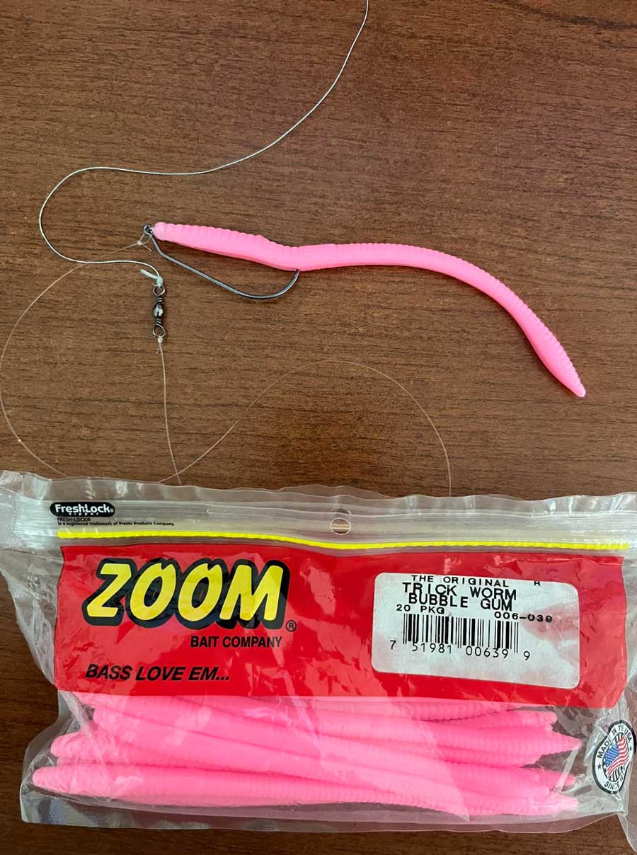 The only lure that saved my day for action was one of my favorites once again, a bubblegum Zoom Trick Worm. I love throwing a jerk bait but when you’re fishing in eel grass with scattered timber, treble hook lures don’t really do that great but the way I rig my worm it will DANCE erratically under the surface which the bass can’t resist. I throw this worm on a 6 1/2’ medium heavy spinning outfit lined with 20-pound Yo Zuri SuperBraid main line. I then attach a barrel swivel to this, on the other end of the swivel I tie about 20-24” of fluorocarbon leader. Then to make it complete I like using an Owner twist lock 3/0 hook. The swivel is the key to the action for this rig. As you jerk your rod tip it pulls at the swivel so the leader and worm float free in almost a Walk the Dog style presentation under the surface anywhere from 1-3 feet of water.
